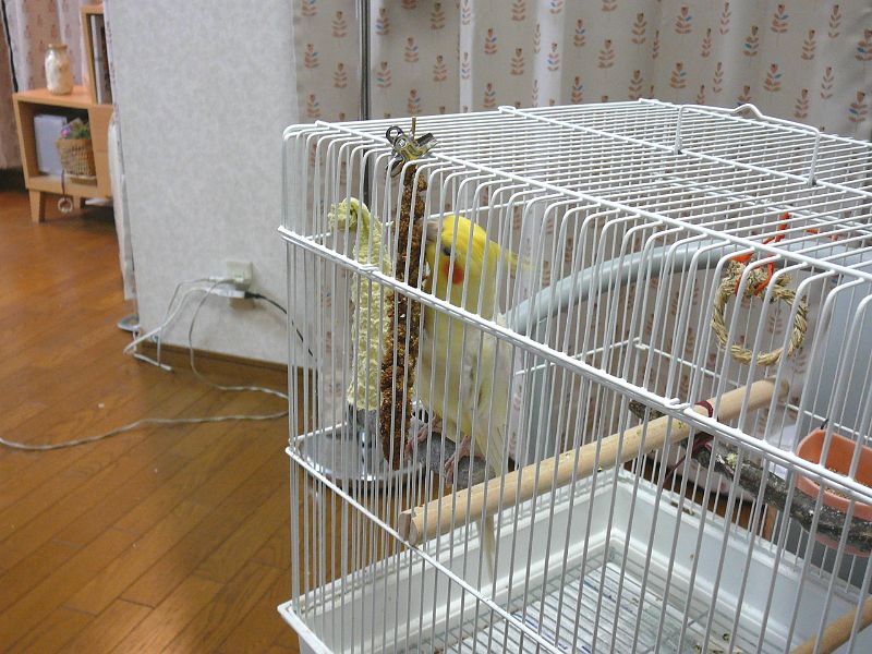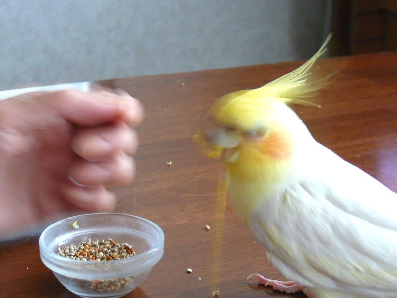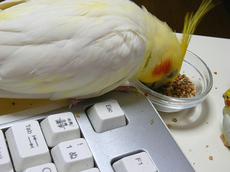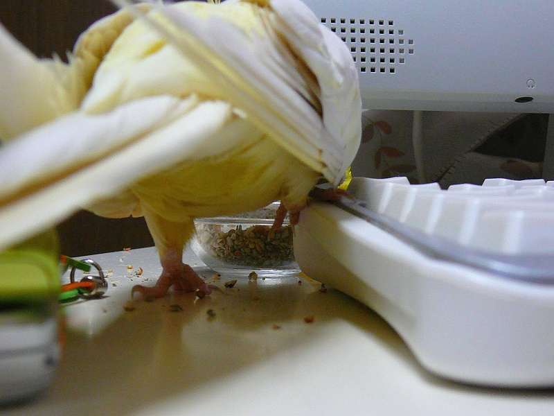 未甘のワガママはどこまでも続きます。食べているエサの箱に落ちたシードのカラ。