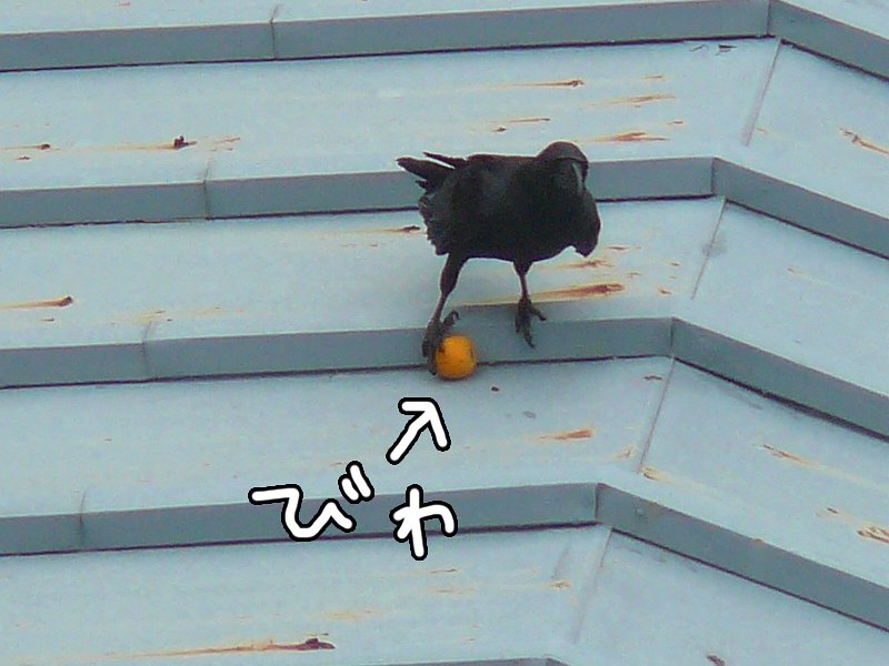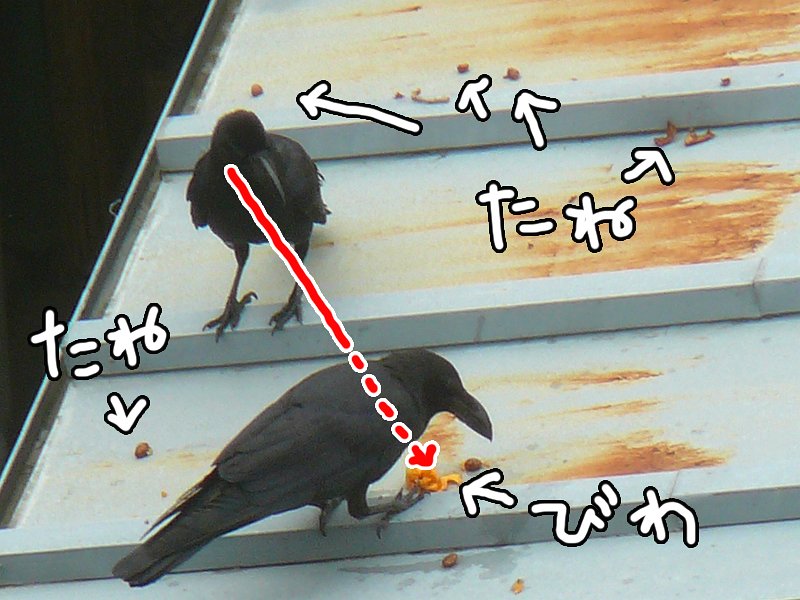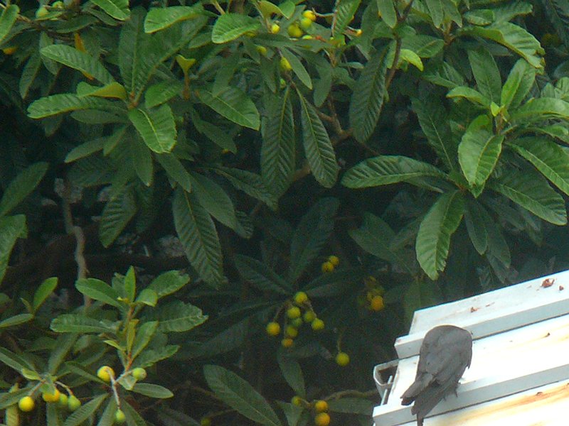 後方のカラスが前方のカラスが食べているびわをチョット見てますが、横取りしたりはしてませんでした。