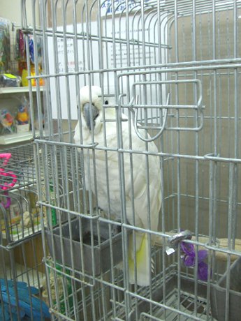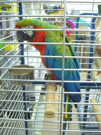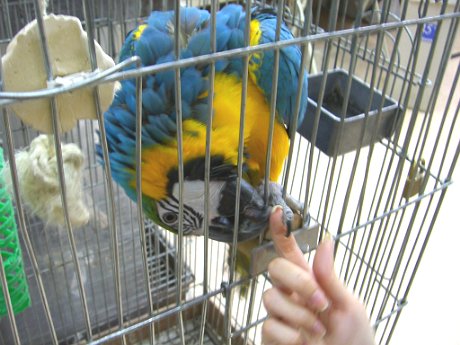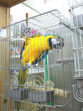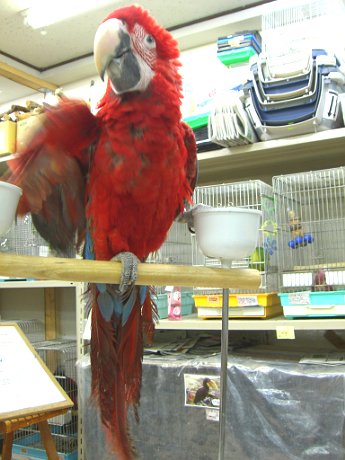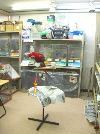 部屋の中央にいたベニコンゴウは、上のルリコンゴウと違って、超人見知りっ子でした。