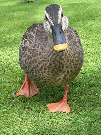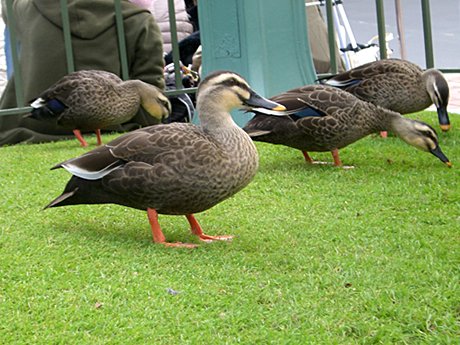 昼のパレードを座って待っている間、芝に鴨がいました。